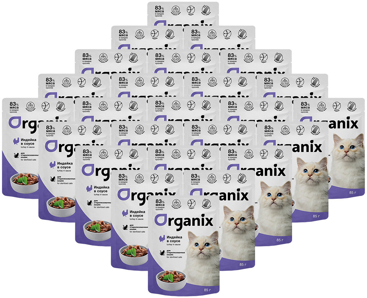 Купить ORGANIX для взрослых кастрированных котов и стерилизованных кошек с индейкой в соусе (85 гр х 25 шт)