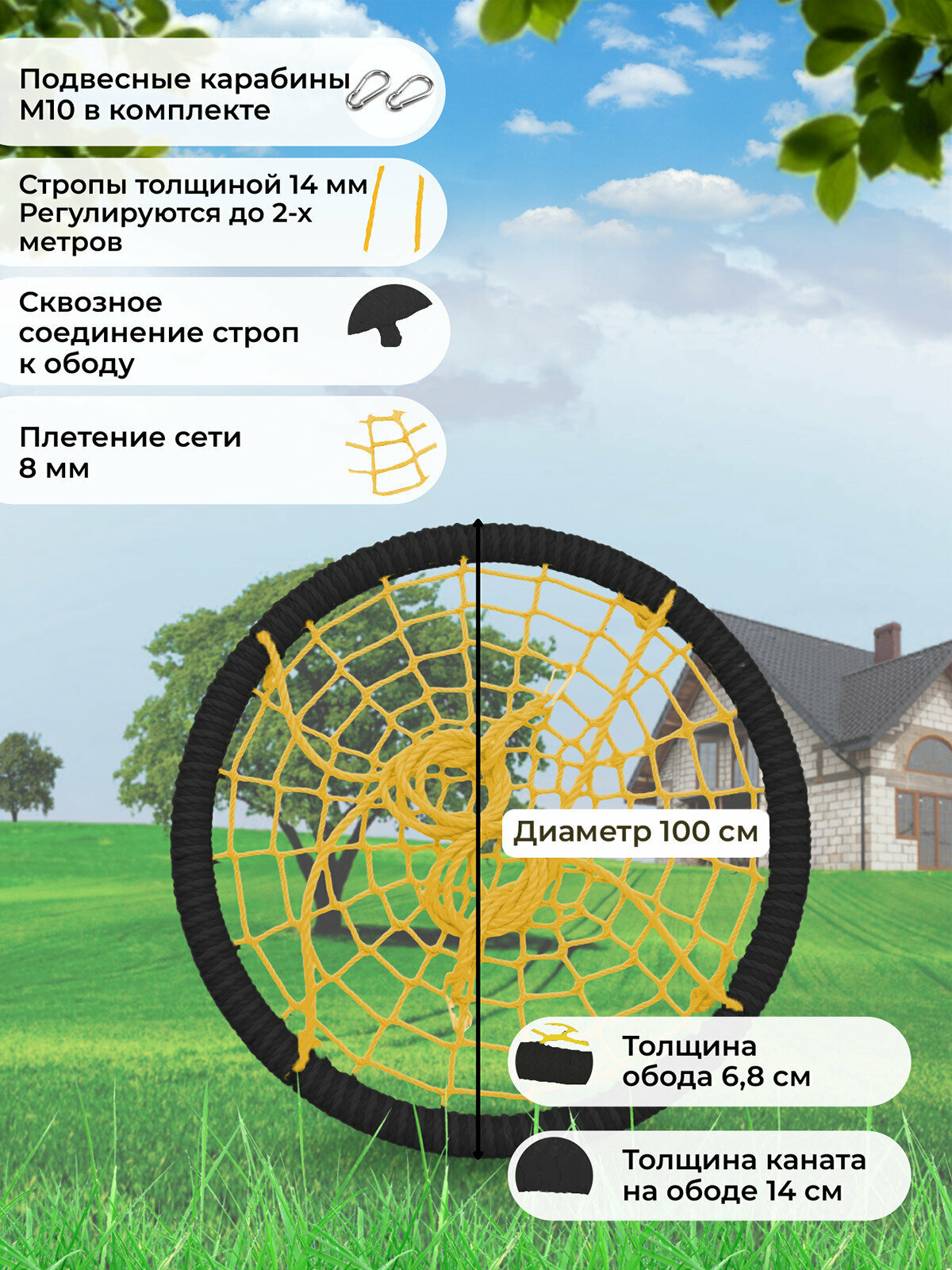 Детские Качели гнездо закачайся плюс диаметр 100 см цвет обода Черный цвет сети Желтый толщина каната обода 14 мм толщина каната сети 8 мм интересное: