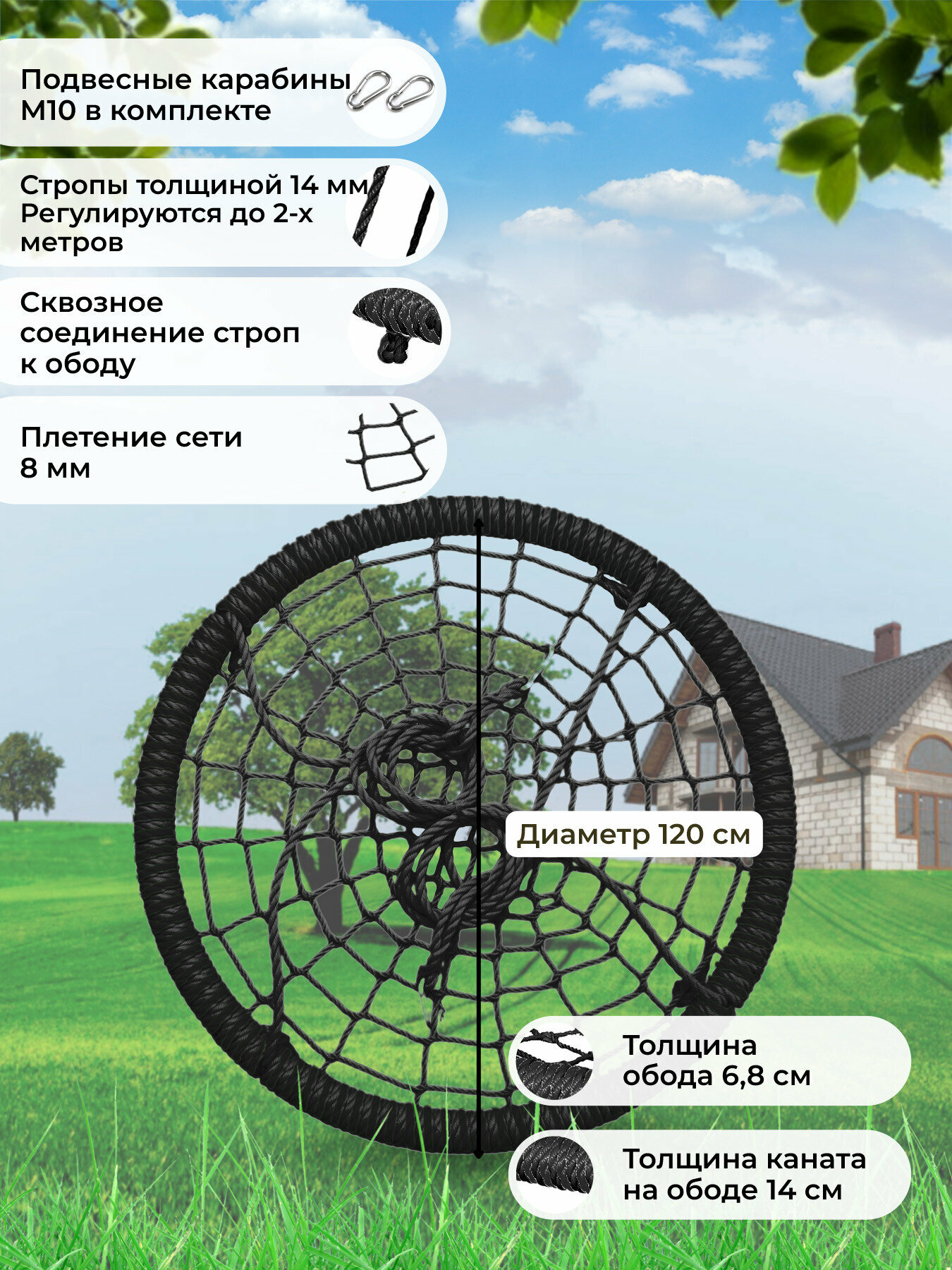Детские Однотонные качели гнездо закачайся плюс диаметр 120 см цвет Черный толщина каната сети 8 мм толщина каната обода 14 мм интересное: