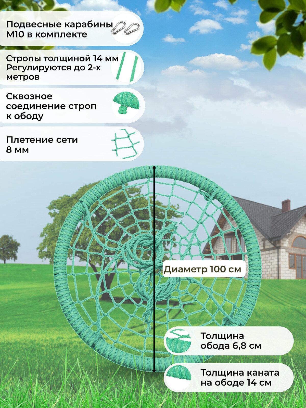 Детские Однотонные качели гнездо закачайся плюс диаметр 100 см цвет Бирюзовый толщина каната сети 8 мм толщина каната обода 14 мм интересное: