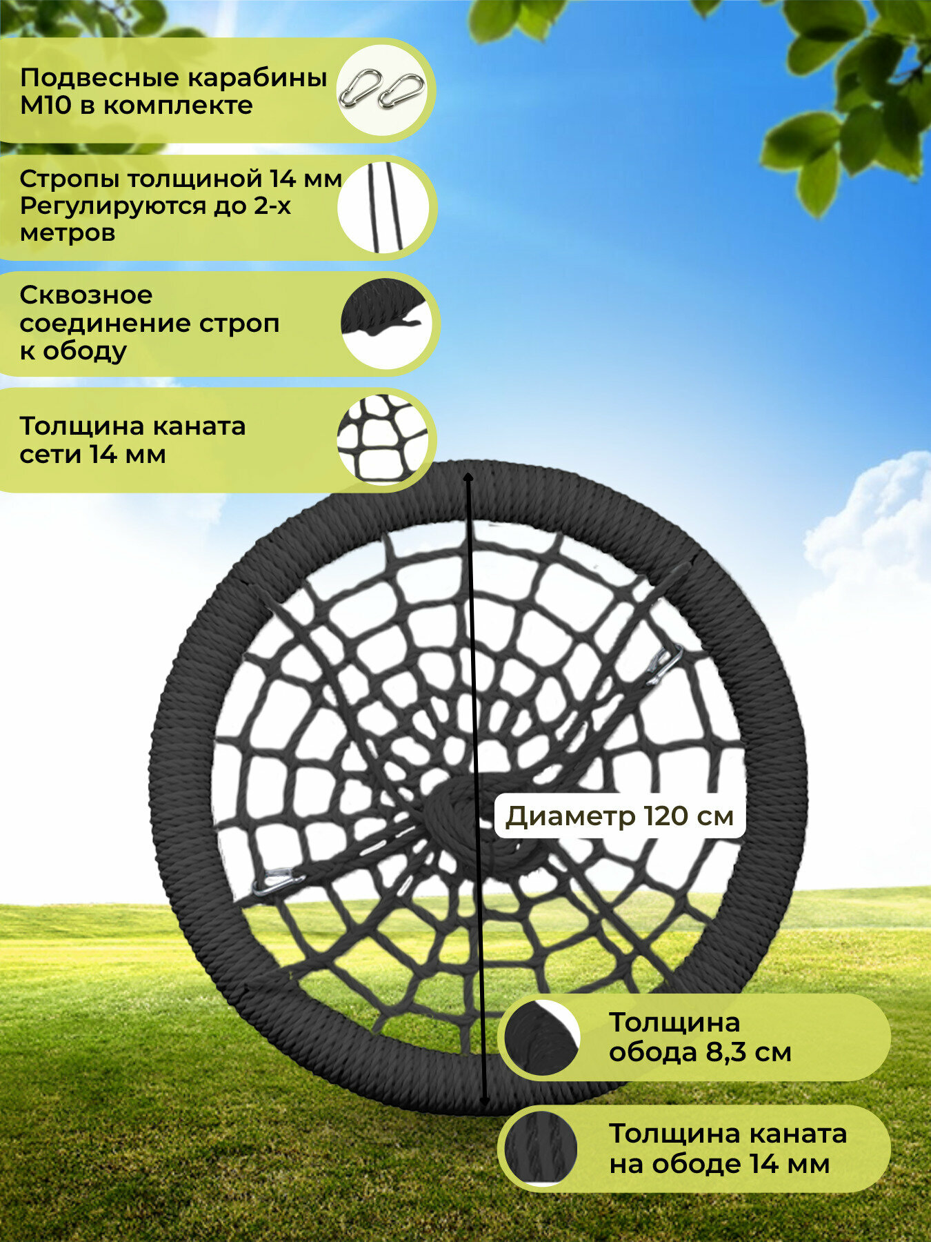 Детские Однотонные качели гнездо PREMIUM диаметр 120 см цвет Черный толщина каната 14 мм интересное: