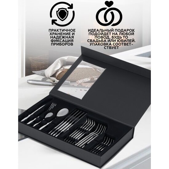 | В набор входит | 6 столовых ложек, 6 чайных ложек, 6 вилок, 6 столовых ножей |