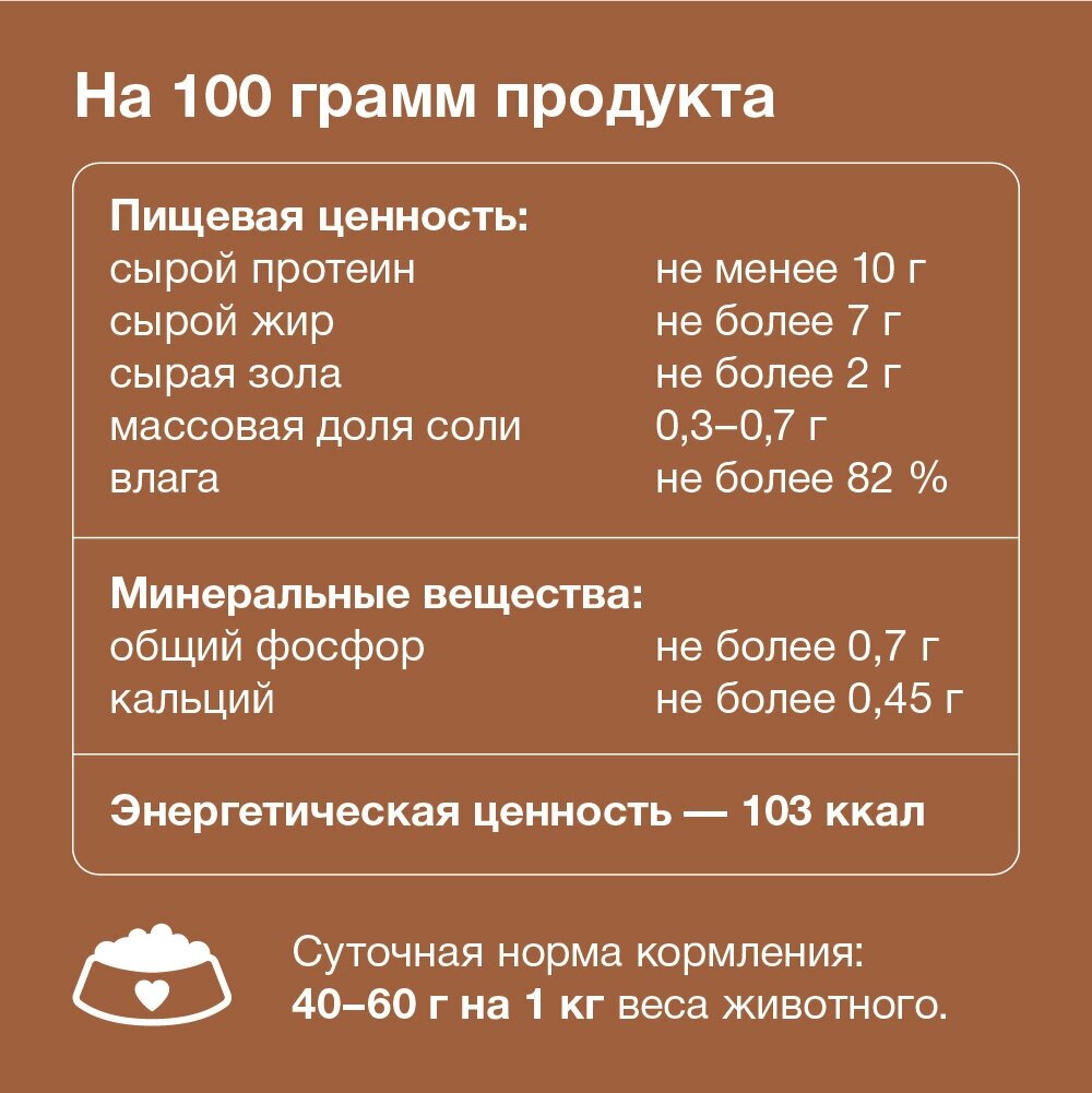 | Пищевая ценность | на 100г продукта: сырой протеин не менее 10.0 г; сырой жир не более 7,0 г; сырая зола не более 2.0 г; соль 0.3-0.5 г; влага не более 82.0% |