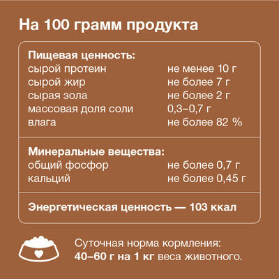 | Пищевая ценность | на 100г продукта: сырой протеин не менее 10.0 г; сырой жир не более 7,0 г; сырая зола не более 2.0 г; соль 0.3-0.5 г; влага не более 82.0% |