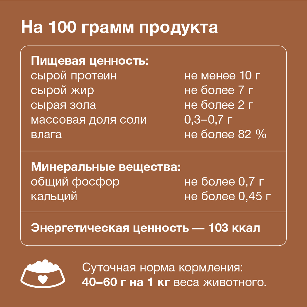 | Пищевая ценность | на 100г продукта: сырой протеин не менее 10.0 г; сырой жир не более 7,0 г; сырая зола не более 2.0 г; соль 0.3-0.5 г; влага не более 82.0% |