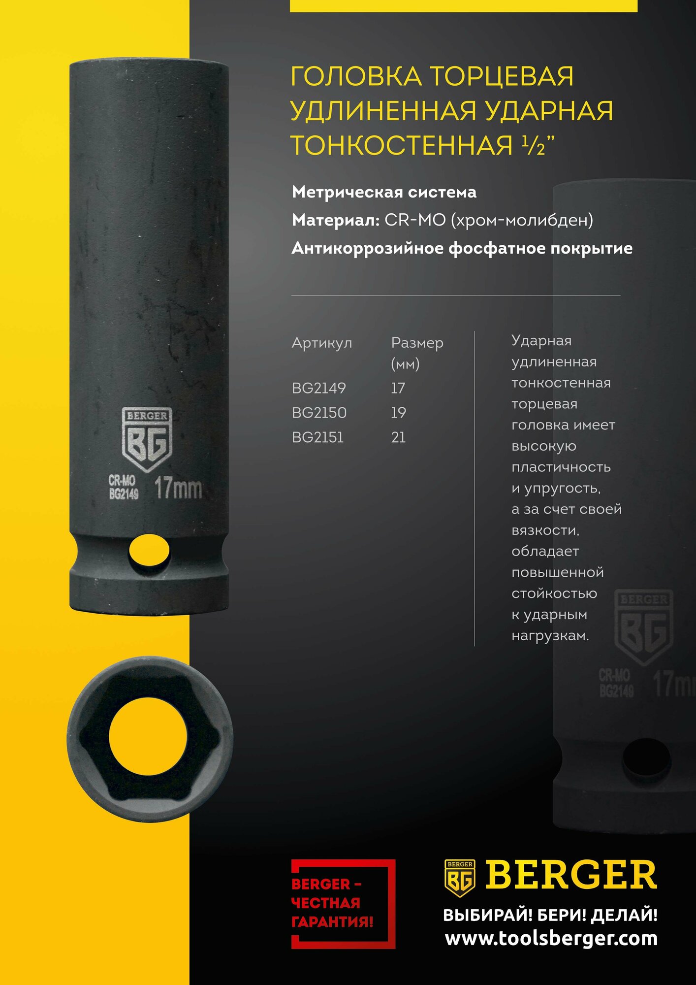 Головка торцевая удлиненная ударная тонкостенная 1/2" 19 мм BERGER BG2150 интересное: