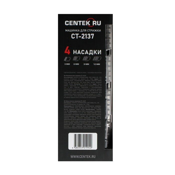 Машинка для стрижки Centek CT-2137, 5 Вт, 3/6/9/12 мм, нерж. сталь, от сети, чёрная , 1 шт. интересное: