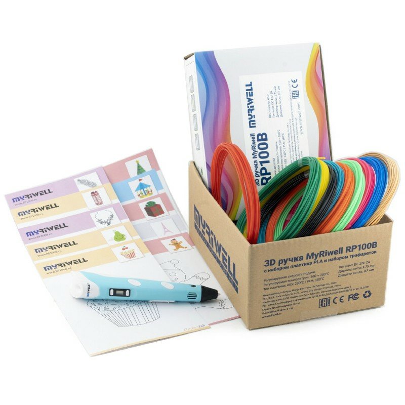 Купить 3D ручка Myriwell RP100B (цвет: голубой) с набором пластика PLA 12 цветов по 10 метров и набором трафаретов для 3D ручек