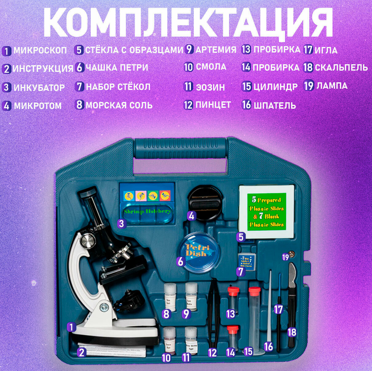 | Комплектация | Скальпель, Игла, Мешалка, Цилиндр с делениями, Пробирки для сбора, Щипцы, Покровные стекла - 7 шт. чистые стикеры - 7 шт, Запасная лампа, Чистые предметные стекла, Нож для резки препаратов, Чашка Петри, Субстрат смолы, Краситель эозин, Морская соль, Икра креветок (артемии), Инкубатор для артемий, Покровные стекла (под коробкой с предметными стеклами). |