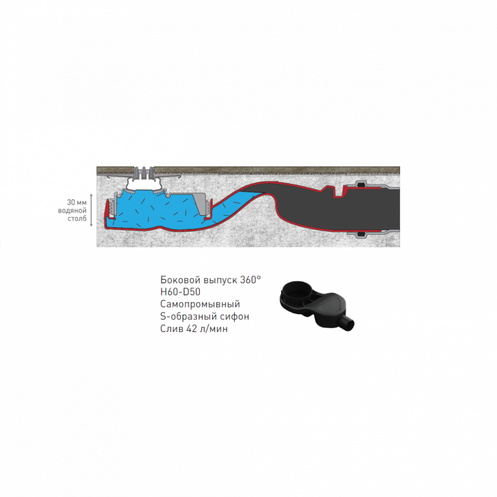 | Дополнительная информация | горизонтальный выпуск D50 H60, пропускная способность 42л/мин, монтаж 360°, самопромывной S-образный сифон PP, направление выпуска / тип слива: боковое, сетка для волос (пластик), комплект гидроизоляции, монтажная заглушка (пенопласт), монтажный ключ (пластик) |