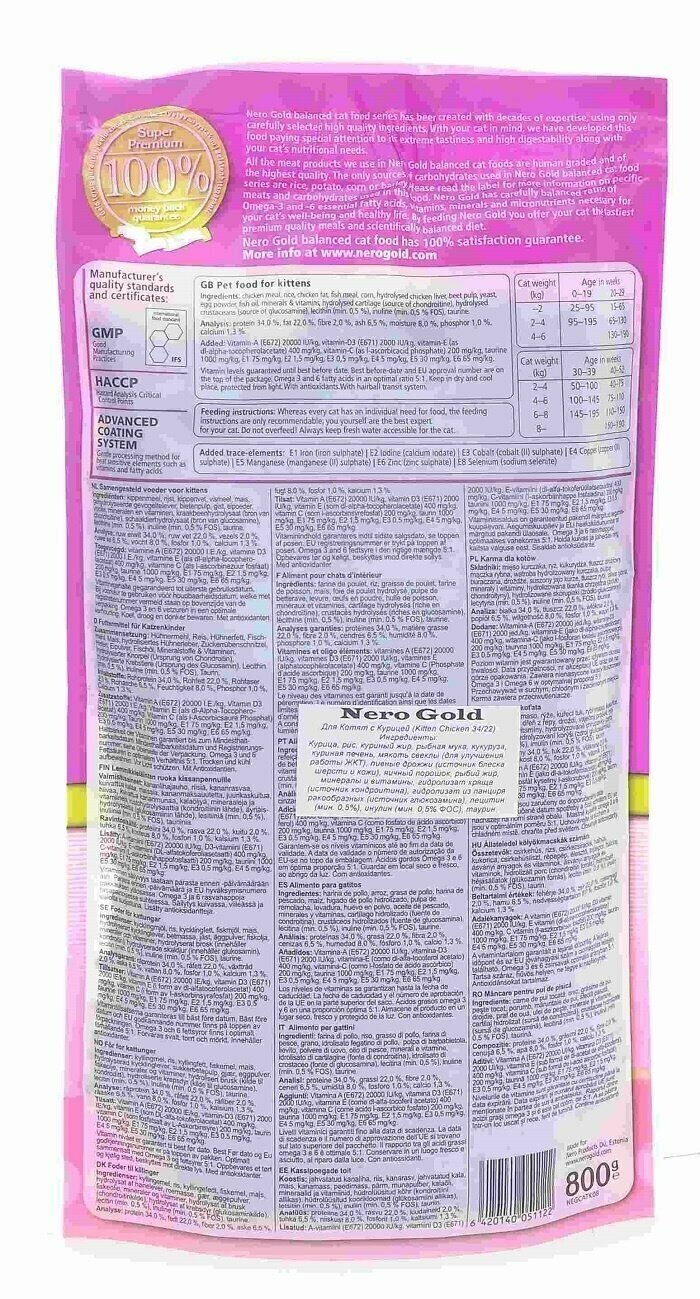 Nero Gold Сухой корм для котят с курицей, Kitten Chicken 34/22, 0.8кг