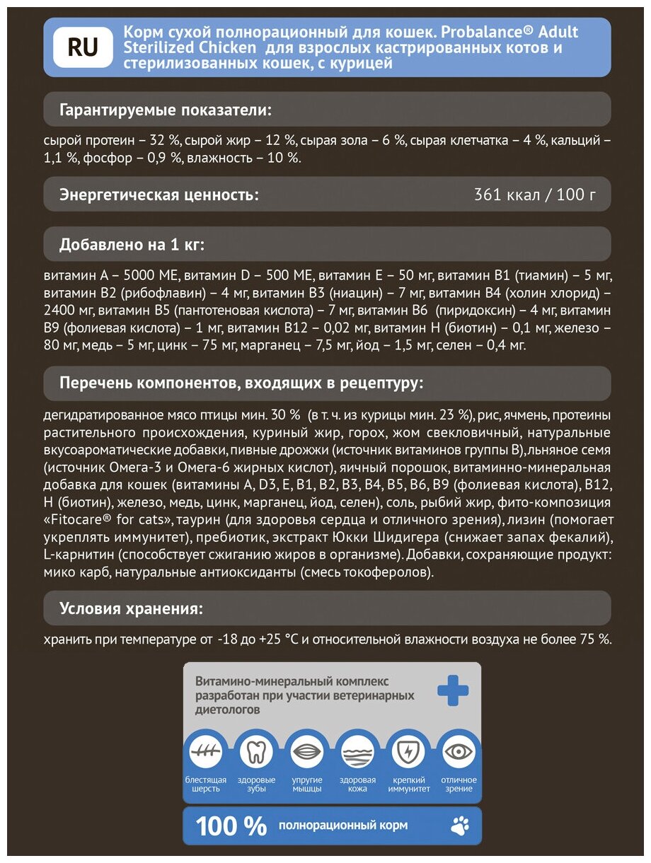 | Особые потребности | для здоровья кожи и блеска шерсти / для стерилизованных/кастрированных / при чувствительном пищеварении |
