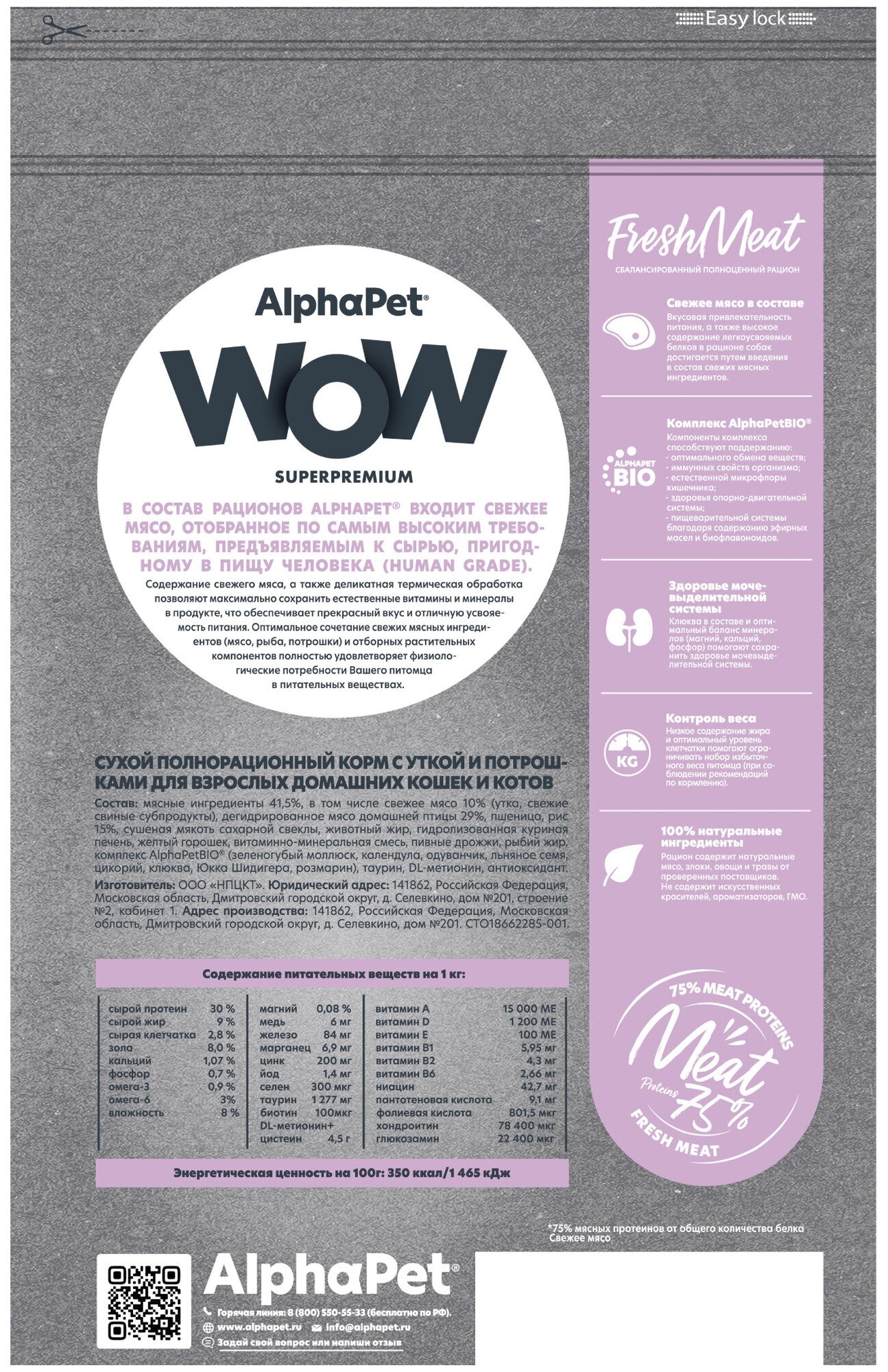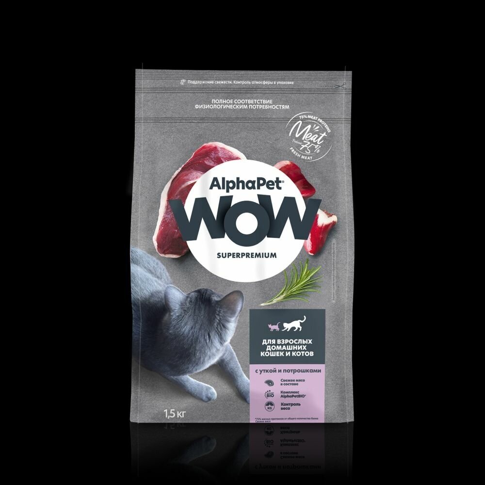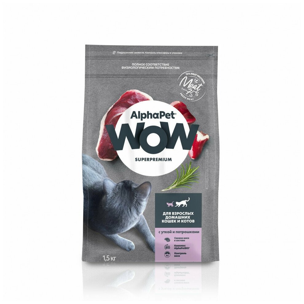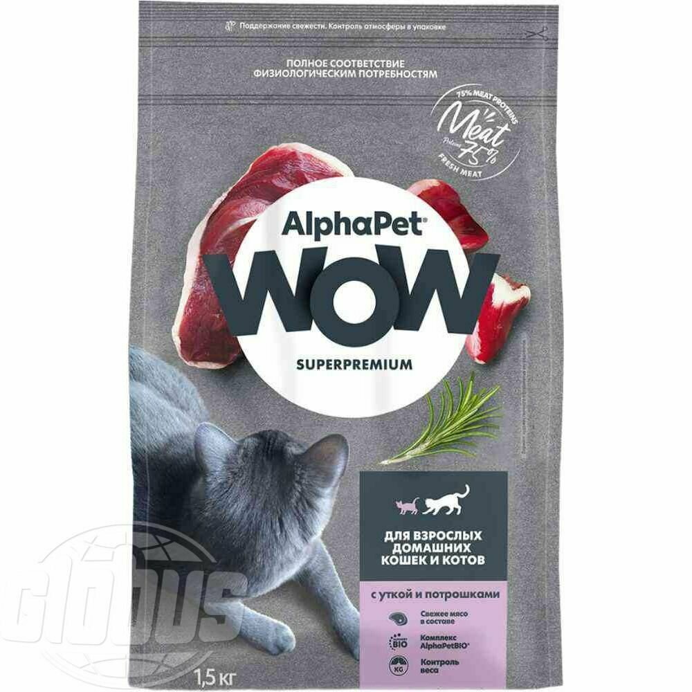 Корм сухой Alphapet Superpremium WOW, с уткой и потрошками для взрослых домашних кошек и котов, 1,5 кг