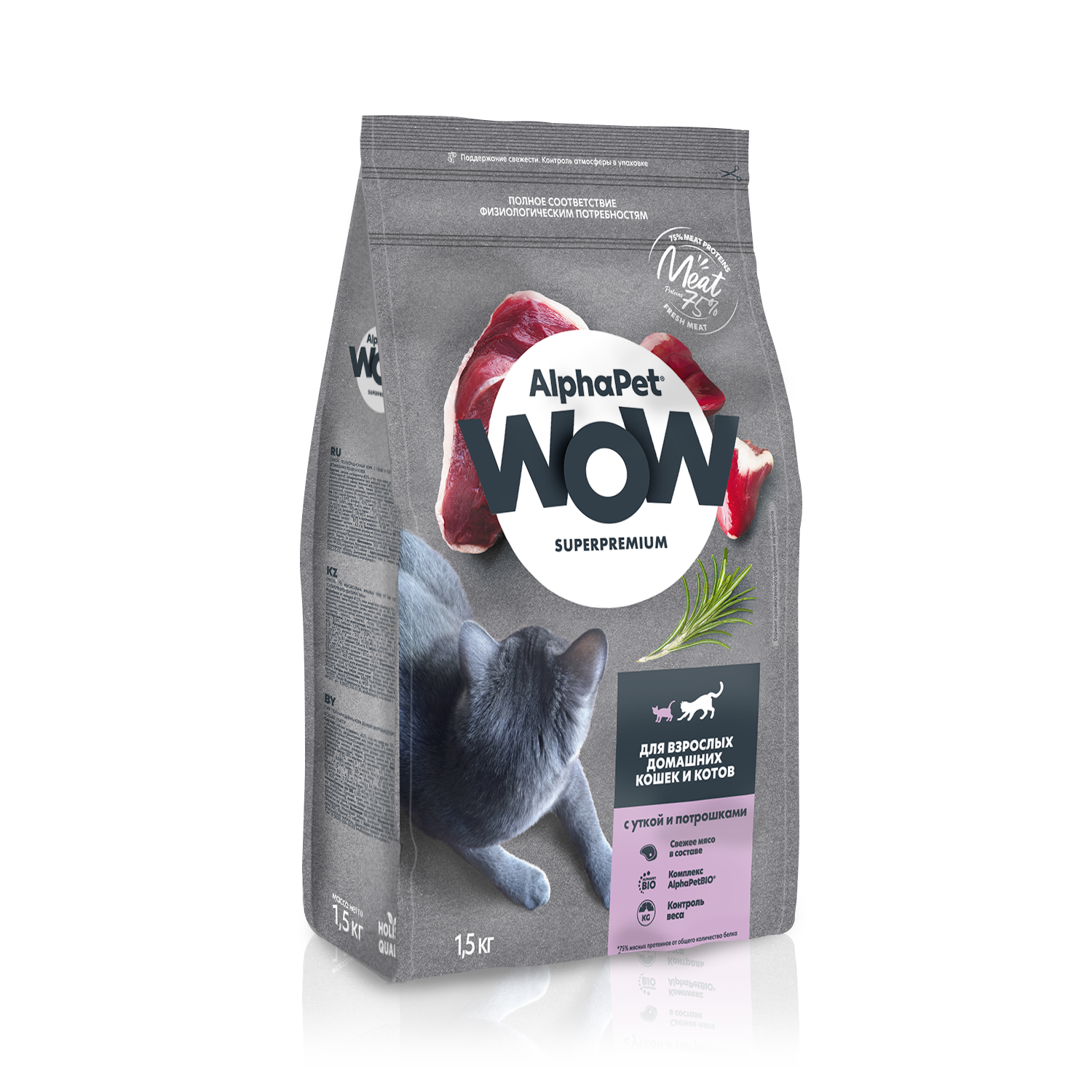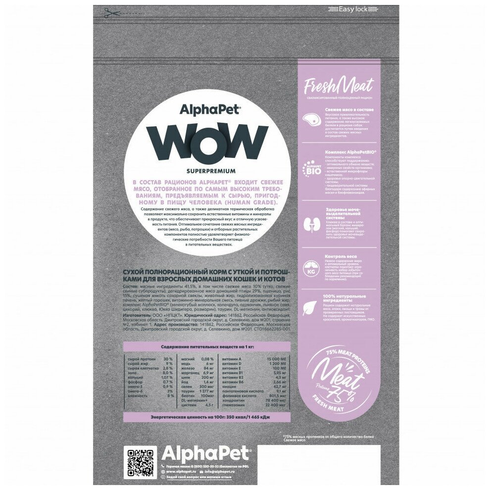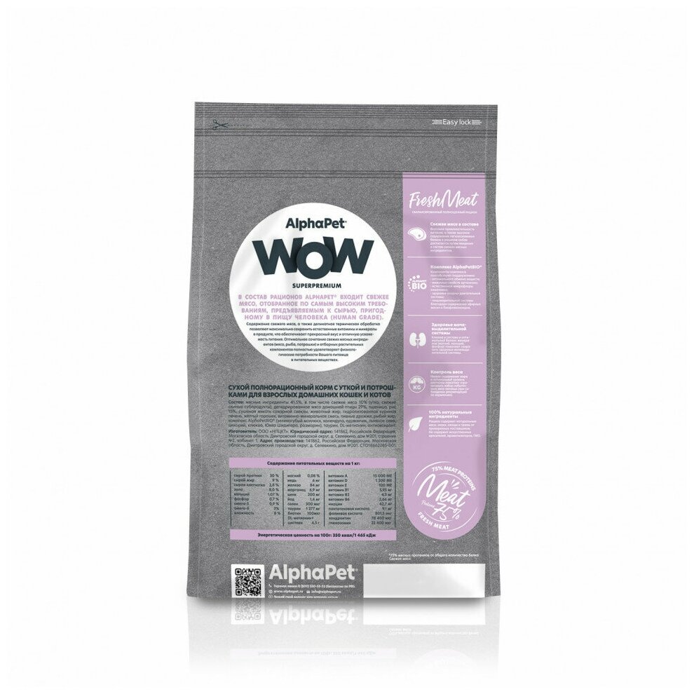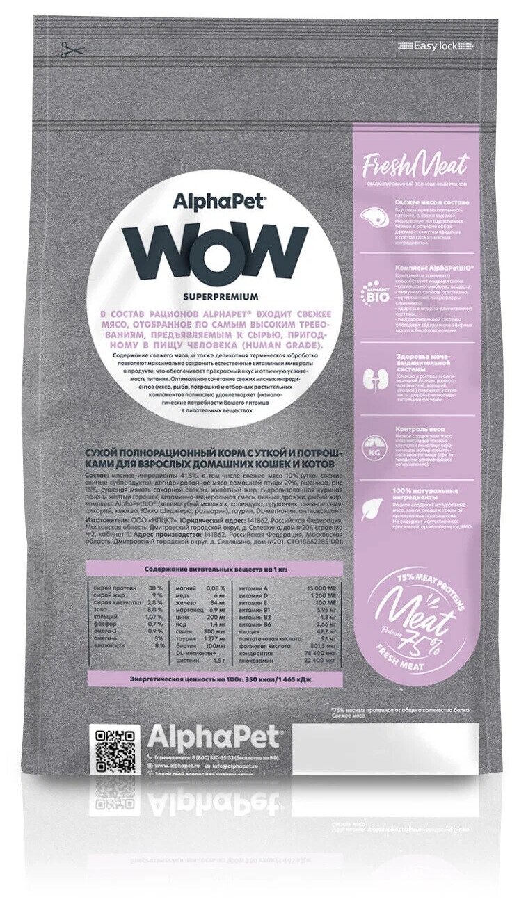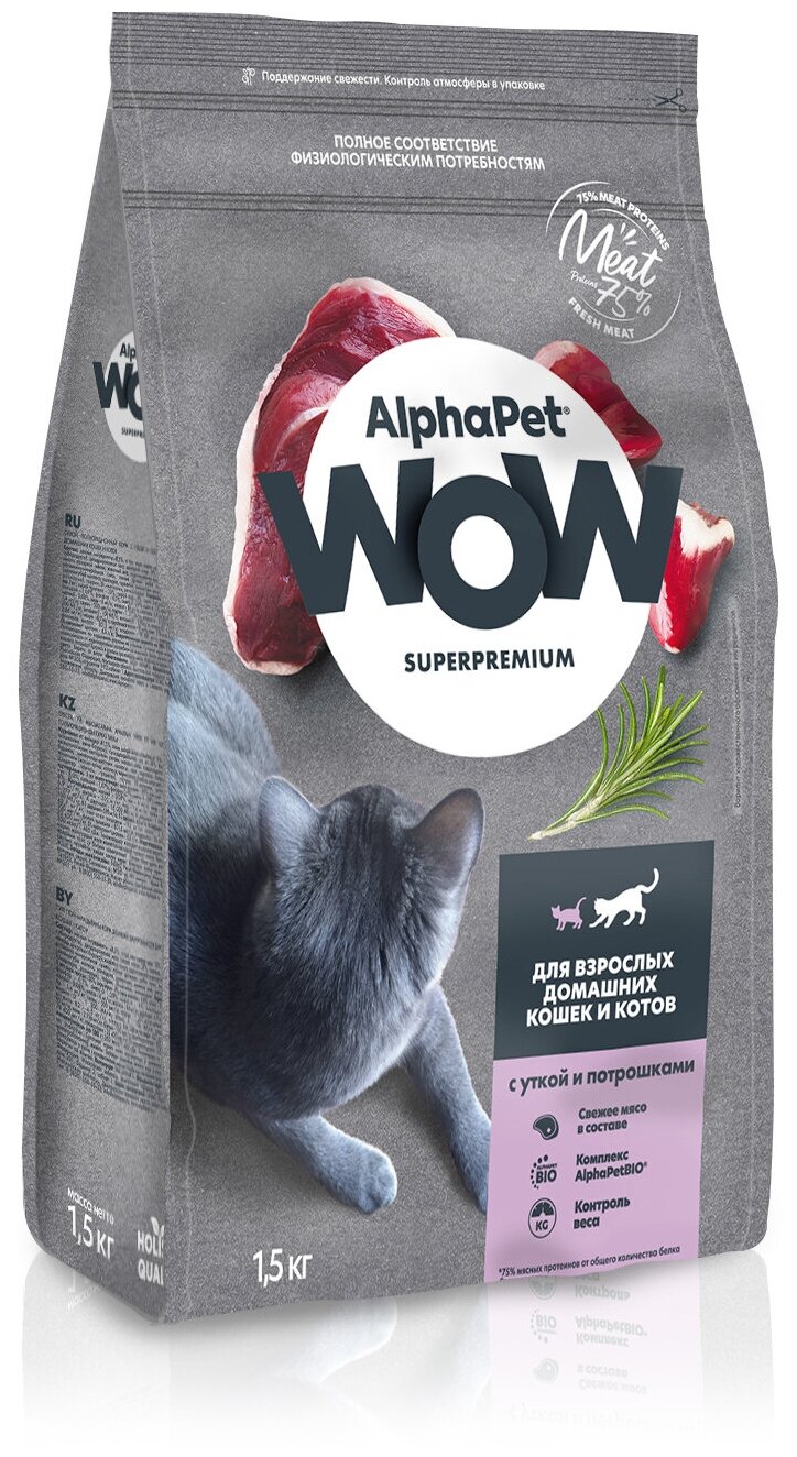 Корм сухой Alphapet Superpremium WOW, с уткой и потрошками для взрослых домашних кошек и котов, 1,5 кг
