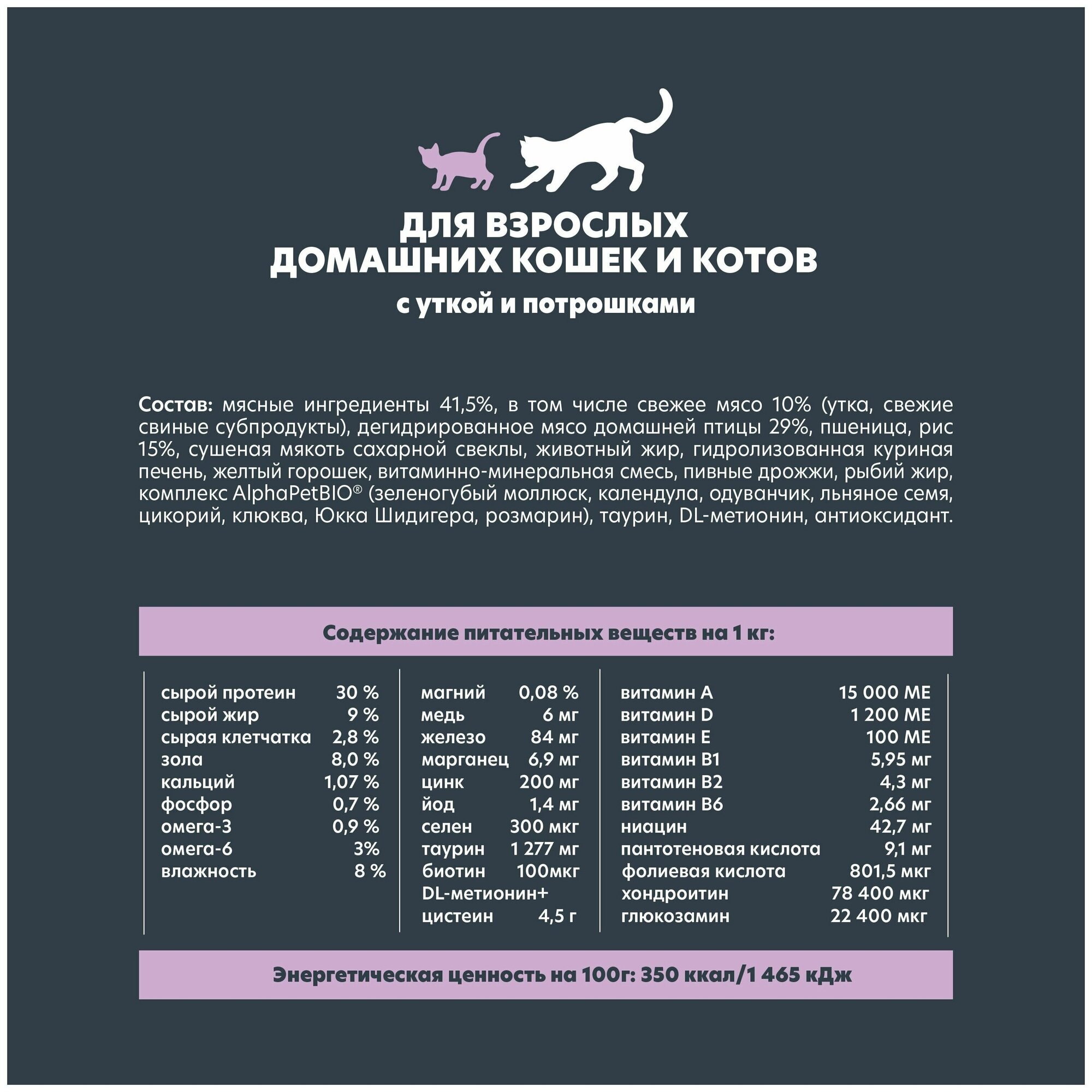 Сухой полнорационный корм с уткой и потрошками для взрослых домашних кошек и котов АльфаПет 1,5 кг