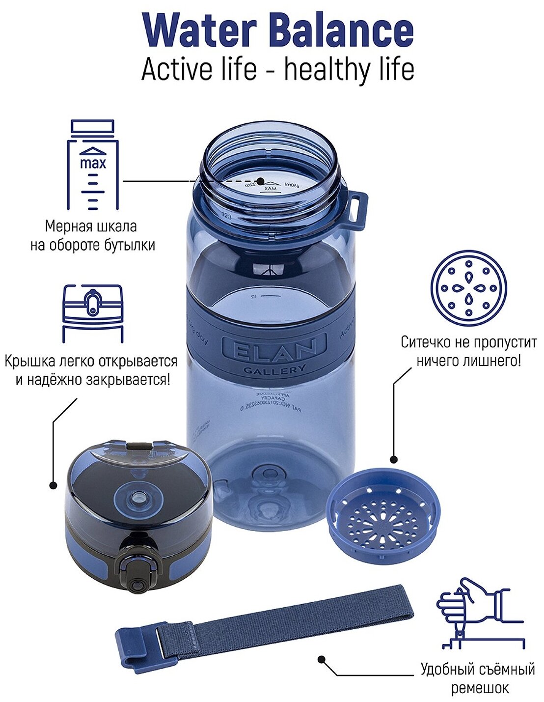Купить Бутылка для воды 650 мл 7,6х7,6х22,5 см Elan Gallery Water Balance, синяя