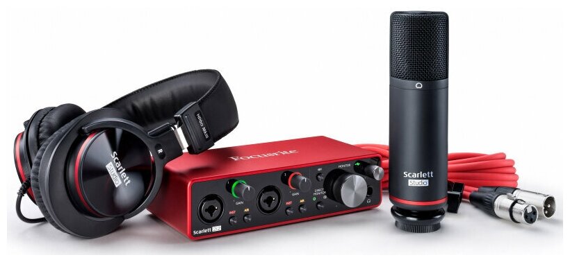 | Дополнительная информация | в комплекте: аудиоинтерфейс Scarlett 2I2 (3-го поколения); конденсаторный микрофон Scarlett Studio CM25 MkIII и зажим для микрофона; наушники Scarlett Studio HP60 MkIII; микрофонный кабель Red XLR (3 м); USB кабель «тип A – тип C» |