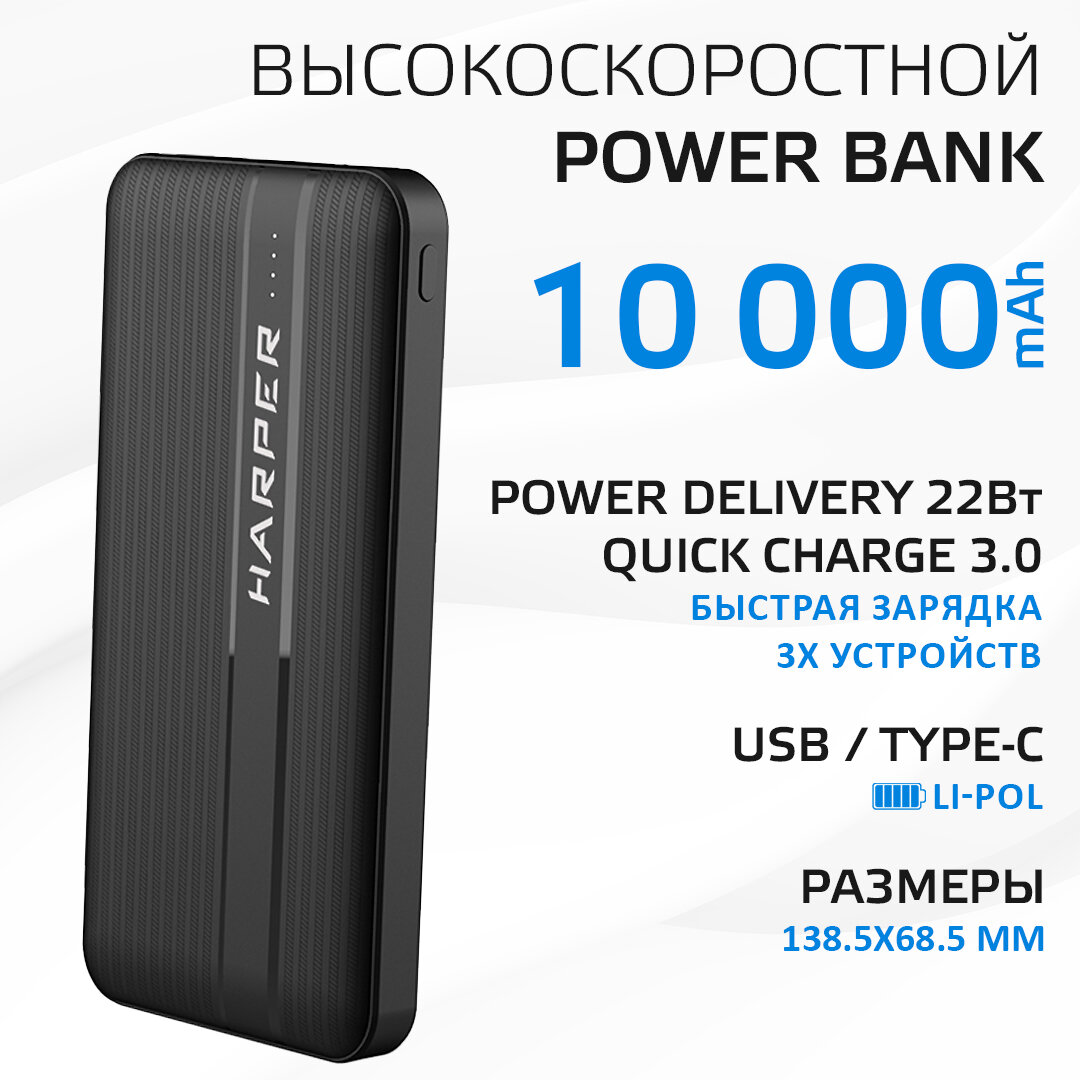 Внешний аккумулятор HARPER PB-10006 (10 000 мАч, Power Delivery и Quick Charge 3.0.), черный