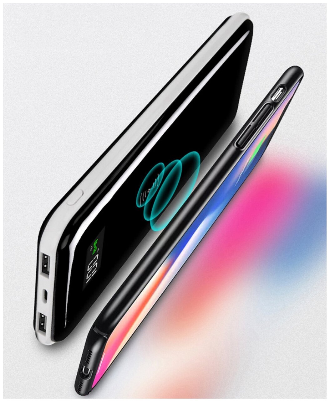 Беспроводной внешний аккумулятор Franzhoff зеркальный чёрный, Power Bank 10000 mAh с мешочком для хранения. Чёрный цвет. Зеркальная поверхность. Индикатор разряда, заряда. С монитором. Умный повербанк. Беспроводная зарядка. интересное: