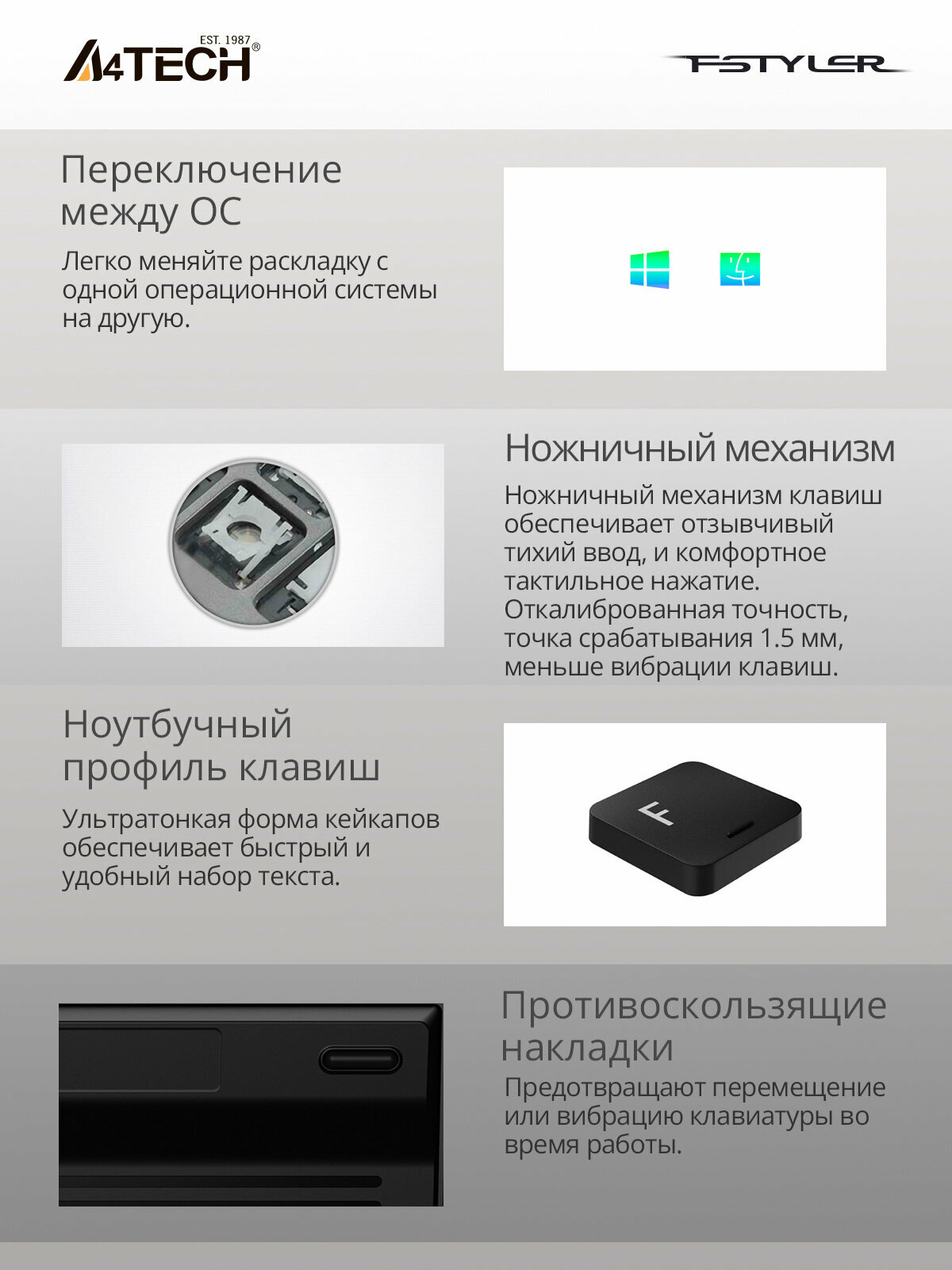 | Дополнительная информация | переключение между ОС: Windows и Mac; бесшумные, низкопрофильные клавиши |