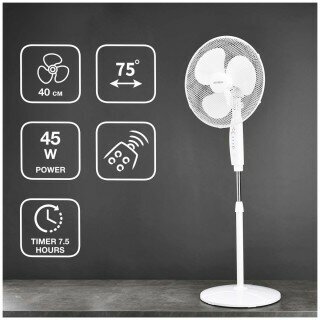 Купил для дома, модель классическая. Что нравится есть пульт управления и таймер. Ставлю на таймер с 10 до 16, на самые жаркие часы. Три лопасти, диаметр большой, поэтому основание крест устойчивое. Регулировка поворота и высоты есть, в том числе наклон. Лопасти находятся под тонкой сетчатой защитой.