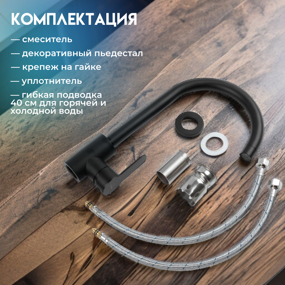 Смеситель для кухни, мойки, однорычажный, высокий, поворотный, нержавеющая сталь, черный, сатин