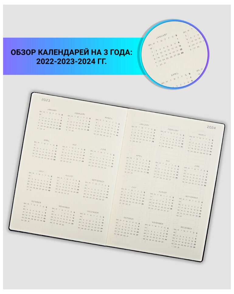 | Дополнительная информация | Датировка: январь - декабрь 2023 (12 месяцев),закругленные углы, 2 закладки-ляссе, внутренний карман |