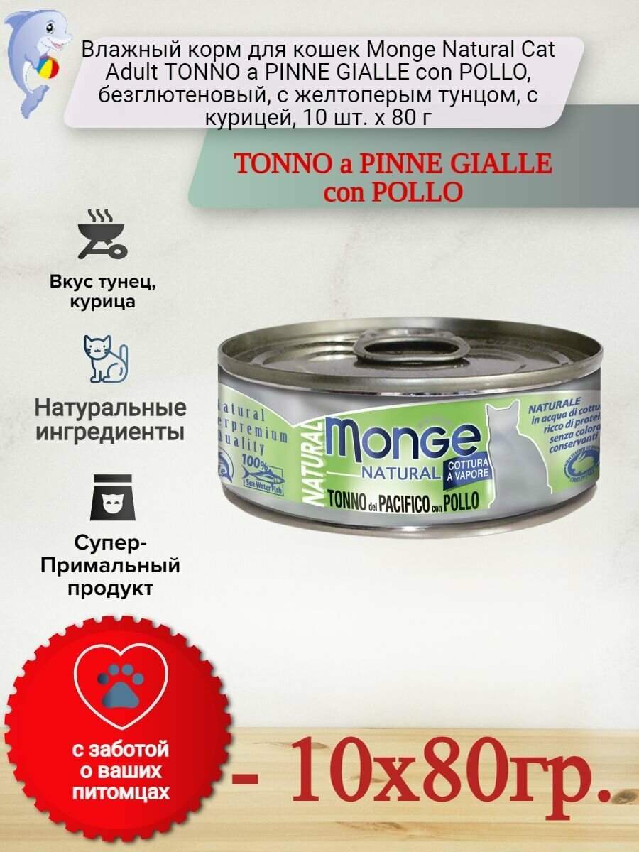 Купить Влажный корм для кошек Monge Natural Cat Adult TONNO a PINNE GIALLE con POLLO, безглютеновый, с желтоперым тунцом, с курицей, 10 шт. х 80 г