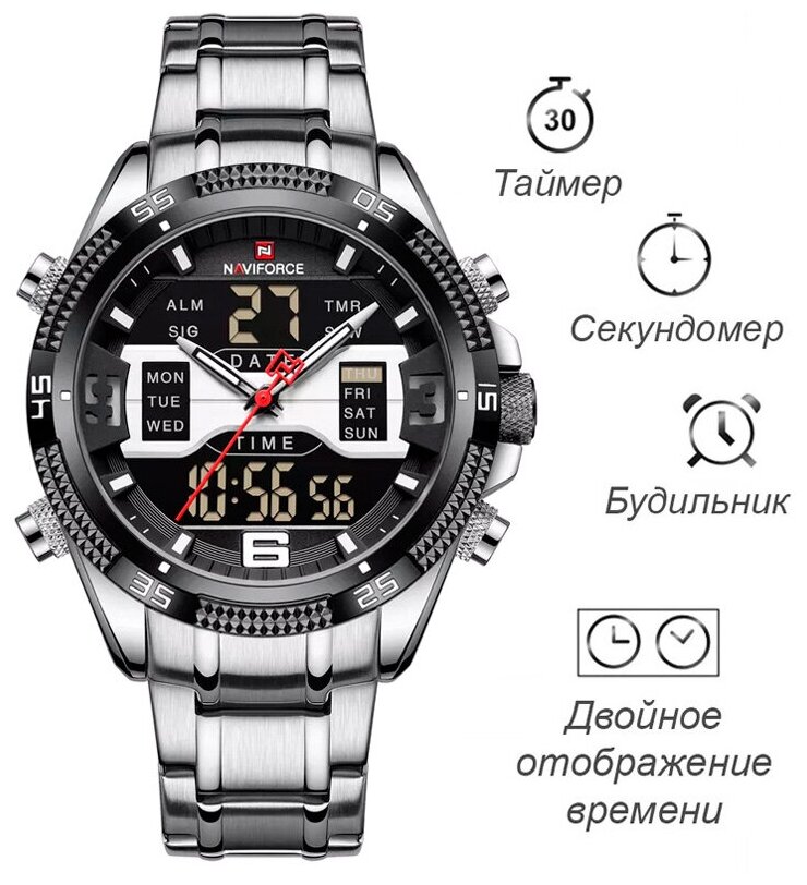 Часы наручные мужские электронные кварцевые Naviforce с таймером и подсветкой, круглые, серебристые/черные