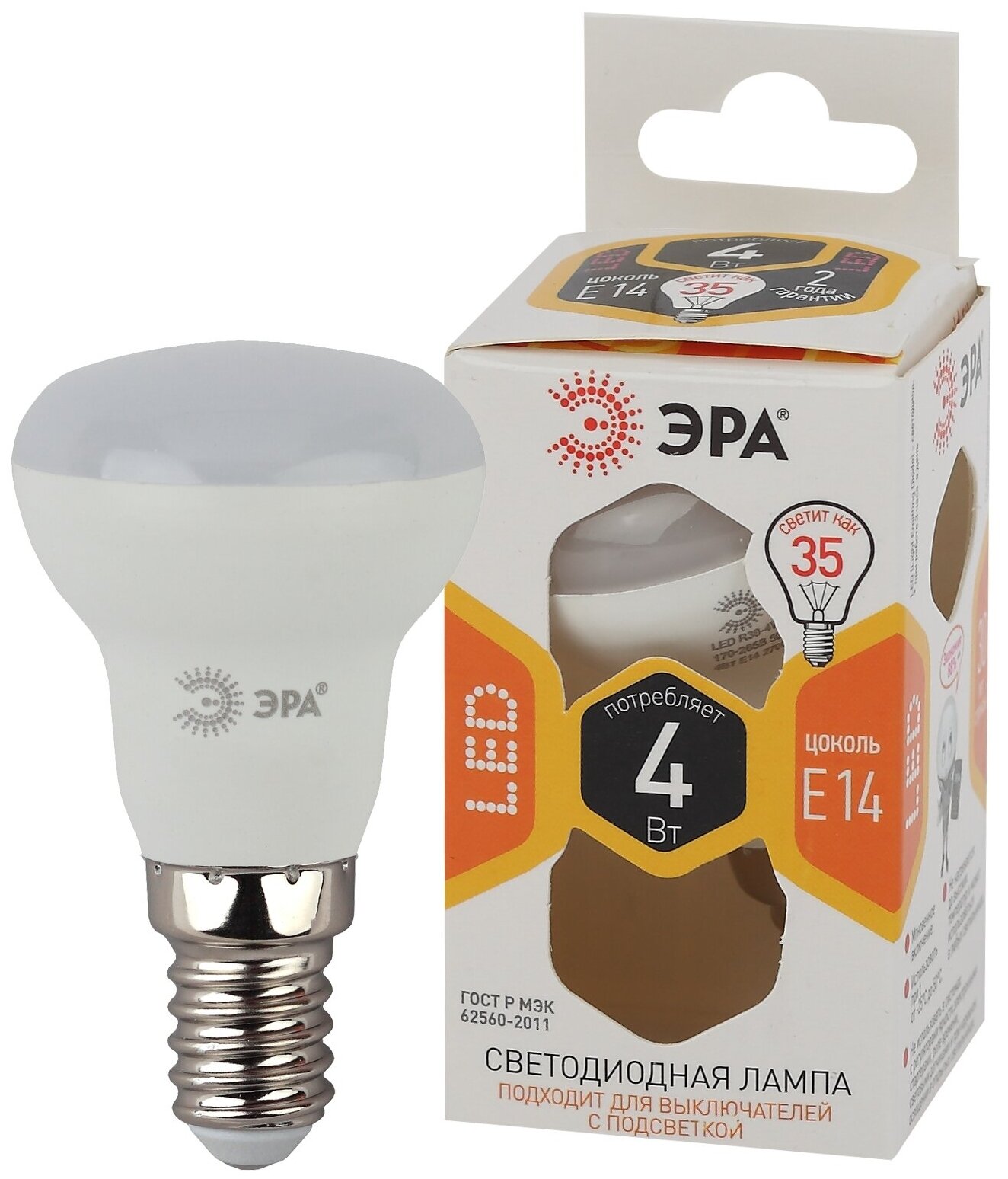 Светодиодная лампа ЭРА LED R39-4W-827-E14 рефлекторная, 4 Вт, теплая, E14 10/100/5600 Б0047930 интересное: