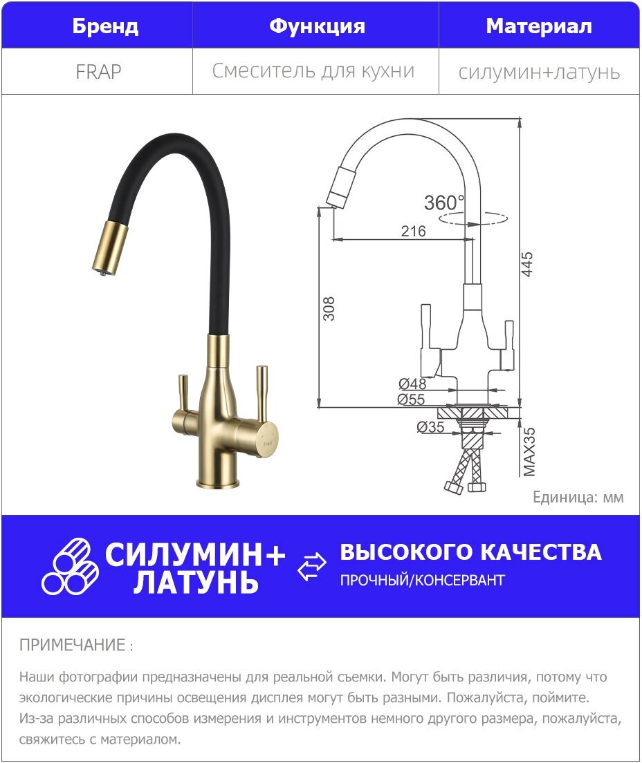 СохранитьFrap Смеситель для кухни с подключением фильтра питьевой воды бронза золотой черный F4396-3 интересное: