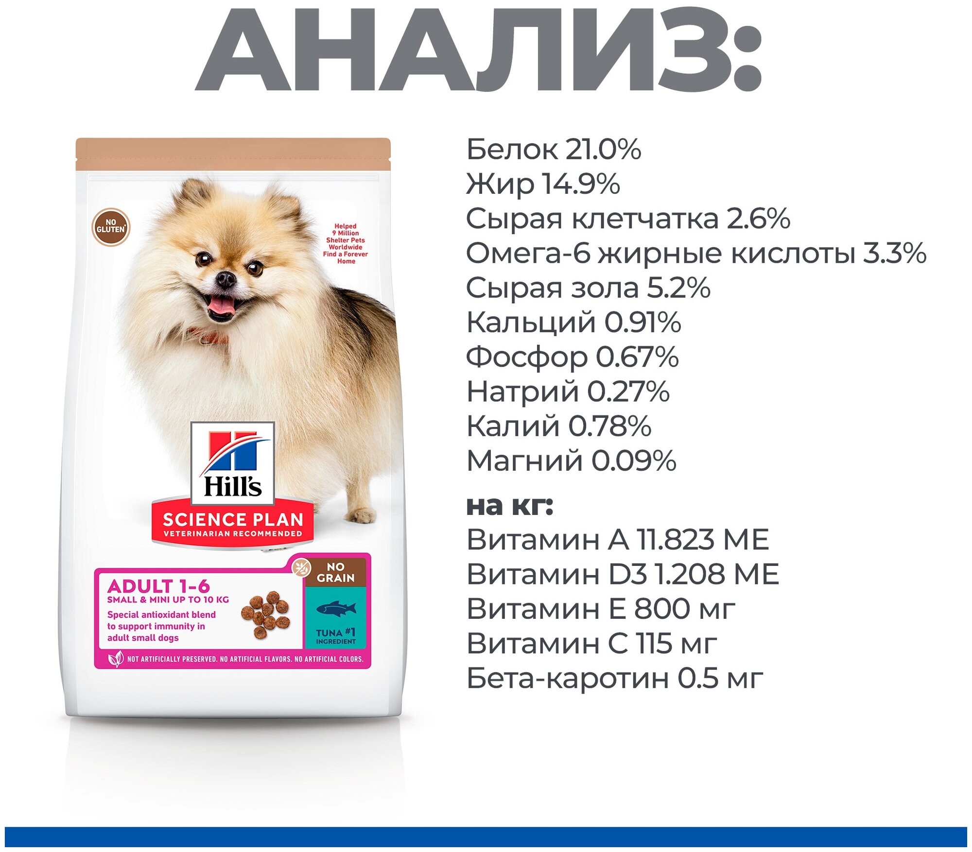 | Состав | мука из тунца (20%), сухой горох, сухой картофель, картофельный крахмал, животный жир, гидролизат белка, растительное масло, желтый горох, сухая мякоть сахарной свеклы, семена льна, минералы, сухая морковь, сухие томатные выжимки, измельченный шпинат, сухие выжимки цитрусовых. |