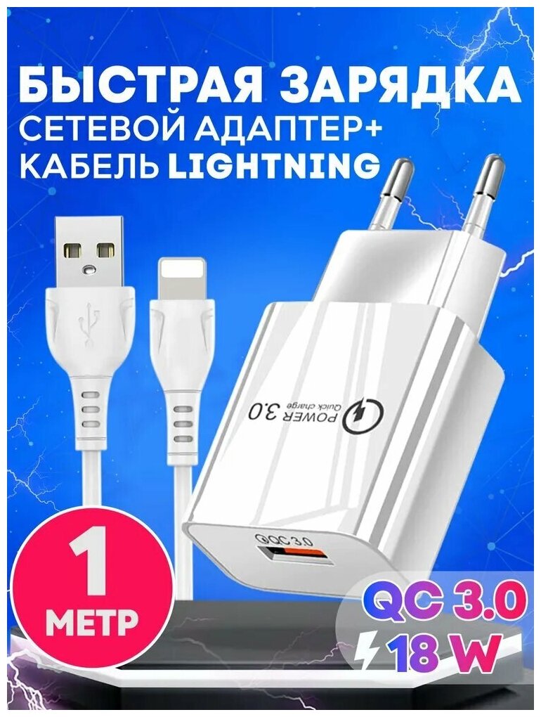 Быстрая зарядка для телефона Quick Charge 3.0, 18W, 3A с кабелем USB Lightning / Сетевой блок питания для Samsung, Xiaomi, Huawei, iPhone / белый цвет интересное: