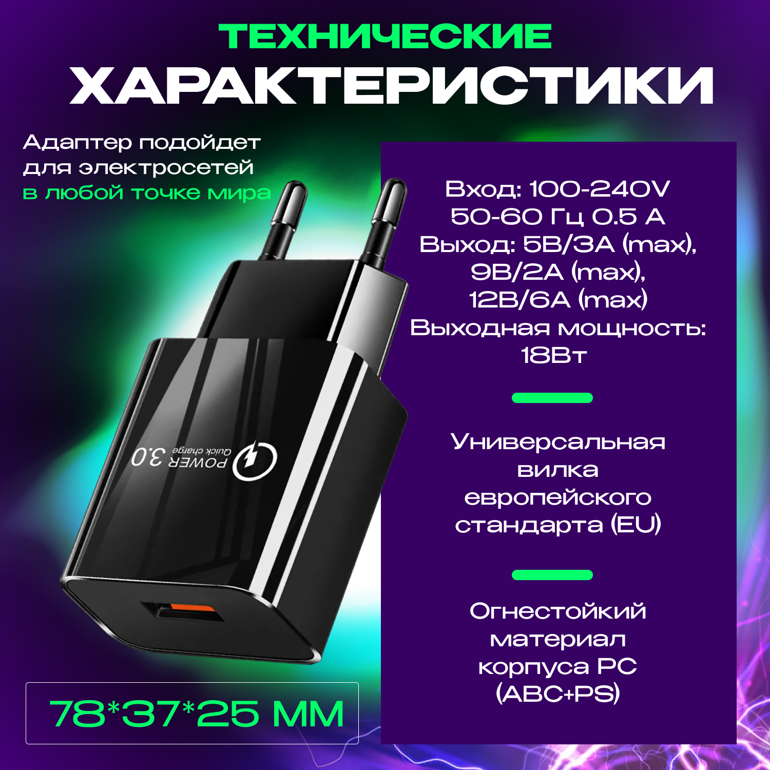 Быстрая зарядка для телефона Quick Charge 3.0, 18W, 3A / Сетевой блок питания для Samsung, Xiaomi, Huawei, iPhone /черный цвет интересное: