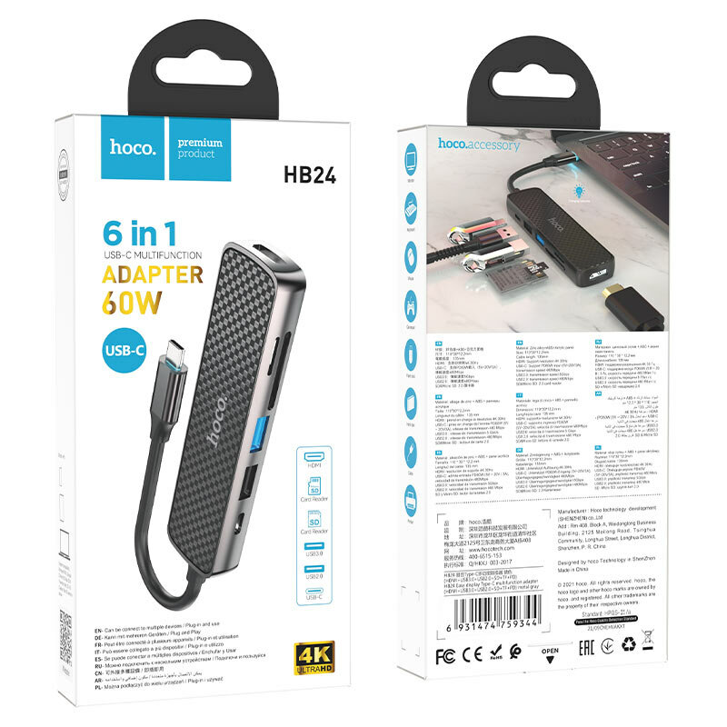 USB-концентратор HOCO HB24, Easy, пластик, силикон, 2 USB выхода. microSD, TF. 1 HDMI, алюминий, 60W, кабель Type-C, цвет: серый интересное: