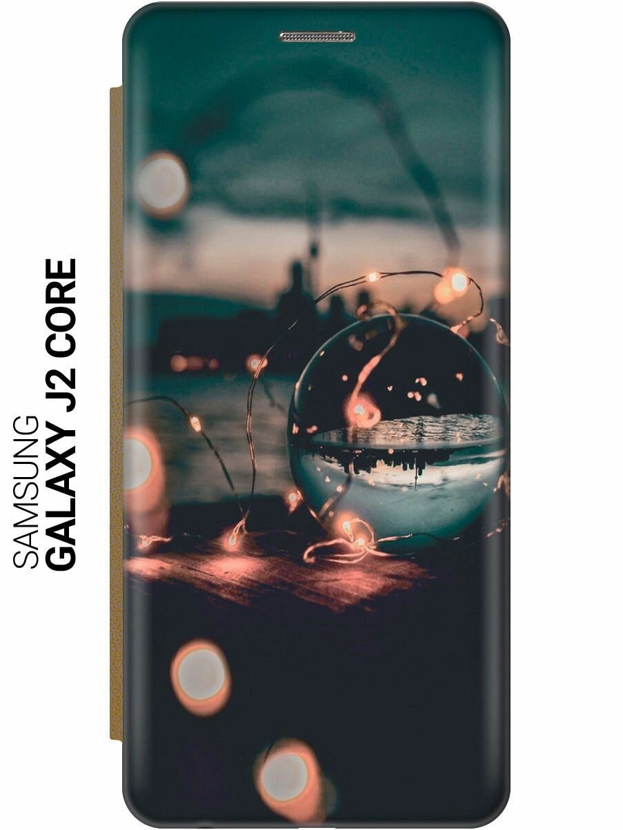 Чехол-книжка на Samsung Galaxy J2 Core, Самсунг Джей 2 Кор c принтом "Гирлянда в лампочке" золотистый
