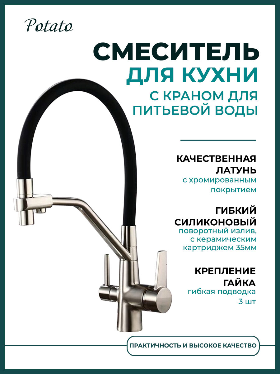 Смеситель для кухни Potato с краном для питьевой воды, хром / черный P4077-6 интересное: