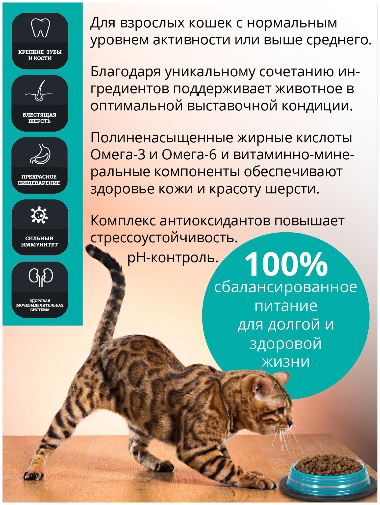 | Особые потребности | для здоровья кожи и блеска шерсти / для здоровья костей и суставов / для стерилизованных/кастрированных / при чувствительном пищеварении |
