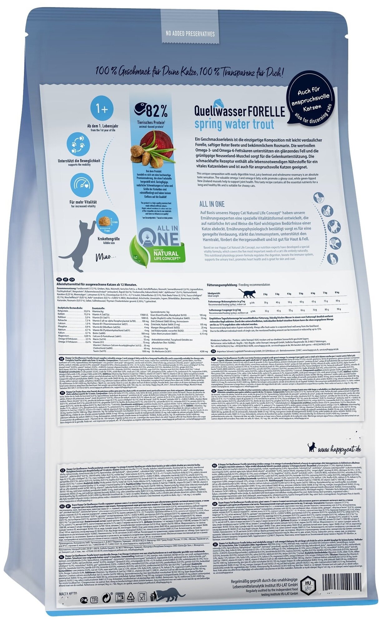 | Состав | мука из форели (17,5 %), мясопродукты, маис, маисовая мука, животные жиры (в т. ч. говяжий), картофельные хлопья, рисовая мука, подсолнечное масло (2,4 %), лигноцеллюлоза, рыбный гидролизат*, рисовый протеин*, свекольная пульпа* (обессахаренная), рапсовое масло (0,6 %), сухое цельное яйцо, хлорид калия, дрожжи*, яблочная пульпа* (0,4 %), хлорид натрия, морковь (0,25 %), морские водоросли |