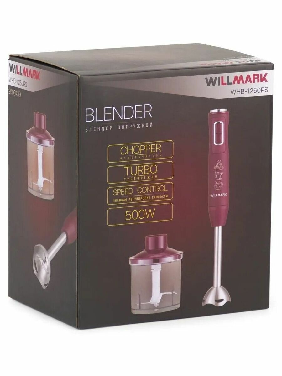Блендер погружной WILLMARK WHB-1250PS (500Вт, рег. скор, турбо режим, Soft touch, измельчитель, бордовый)