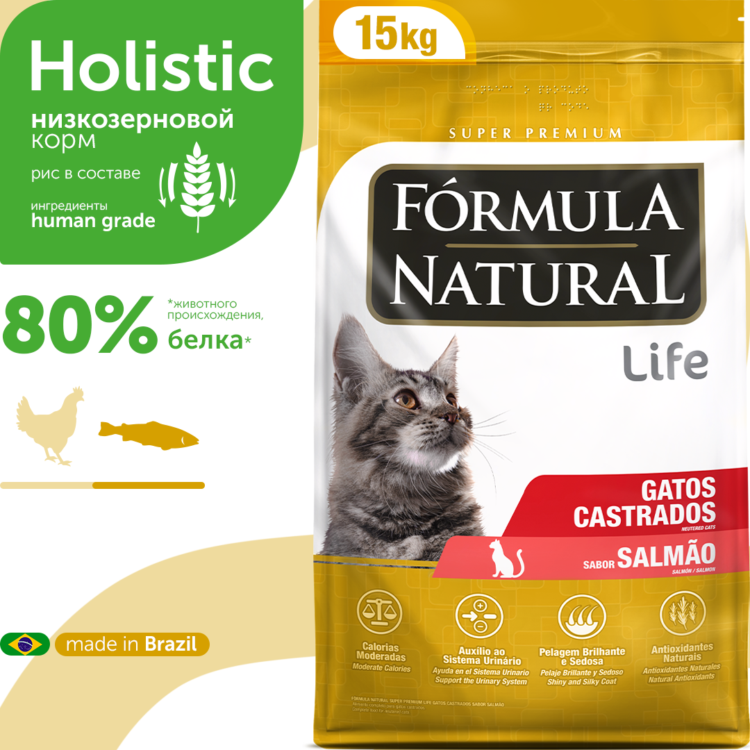 Сохранить15 кг Сухой корм супер премиум для стерилизованных/кастрированных кошек Formula Natural Life - Бразильский, низкозерновой, полнорационный, с лососем интересное: