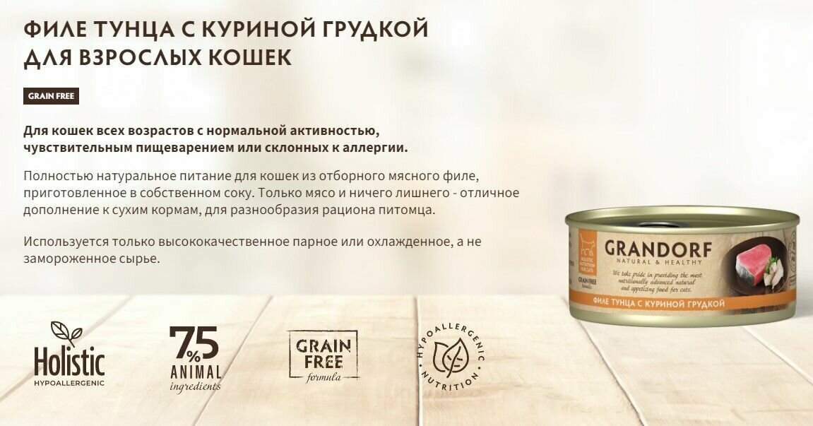 Консервы для кошек Grandorf Holistic Филе тунца с куриной грудкой в собственном соку, 70 г х 6 шт.