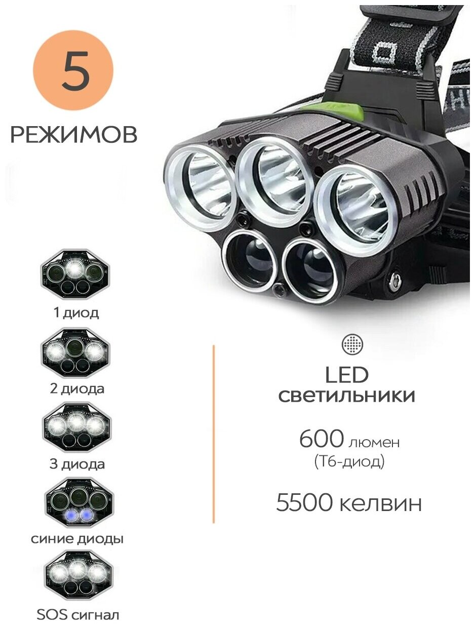 Купить Налобный мощный светодиодный фонарь SimpleShop с регулировкой угла свечения, свет белый и синий, 5 режимов, зарядка от usb, аккумуляторные батареи