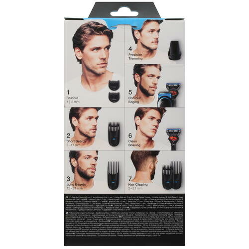 | Дополнительная информация | насадка-гребень для коротких волос (3-11мм), насадка-гребень для длинных волос (13-21 мм), насадка-гребень 1 мм, насадка-гребень 2 мм, насадка для точного стайлинга, бритва Gillette Fusion5 ProGlide с технологией Flexball, зарядное устройство SmartPlug |