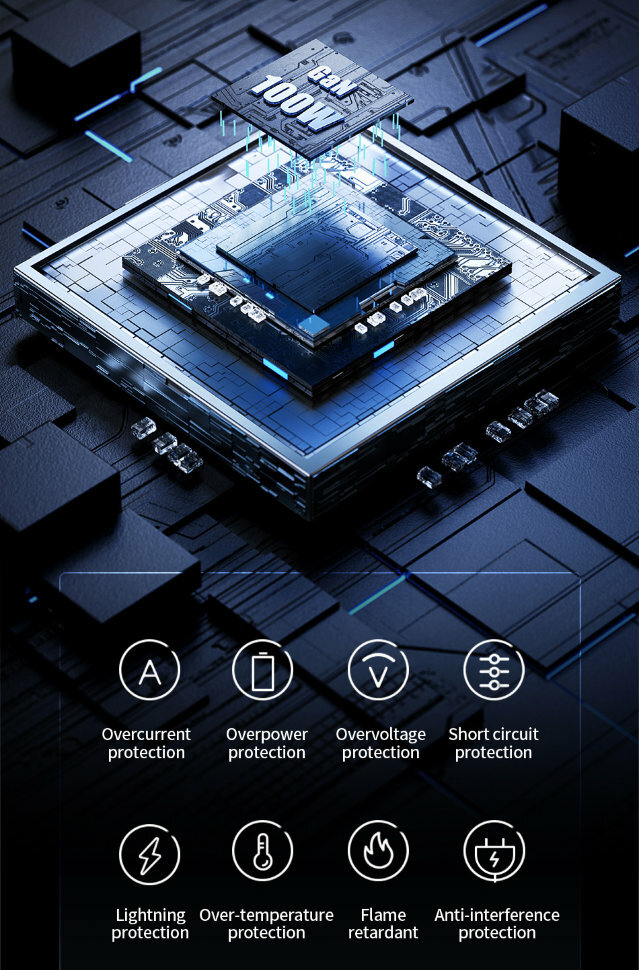 | Особенности | GaN / защита от перегрева / Защита от перегрузки по току |