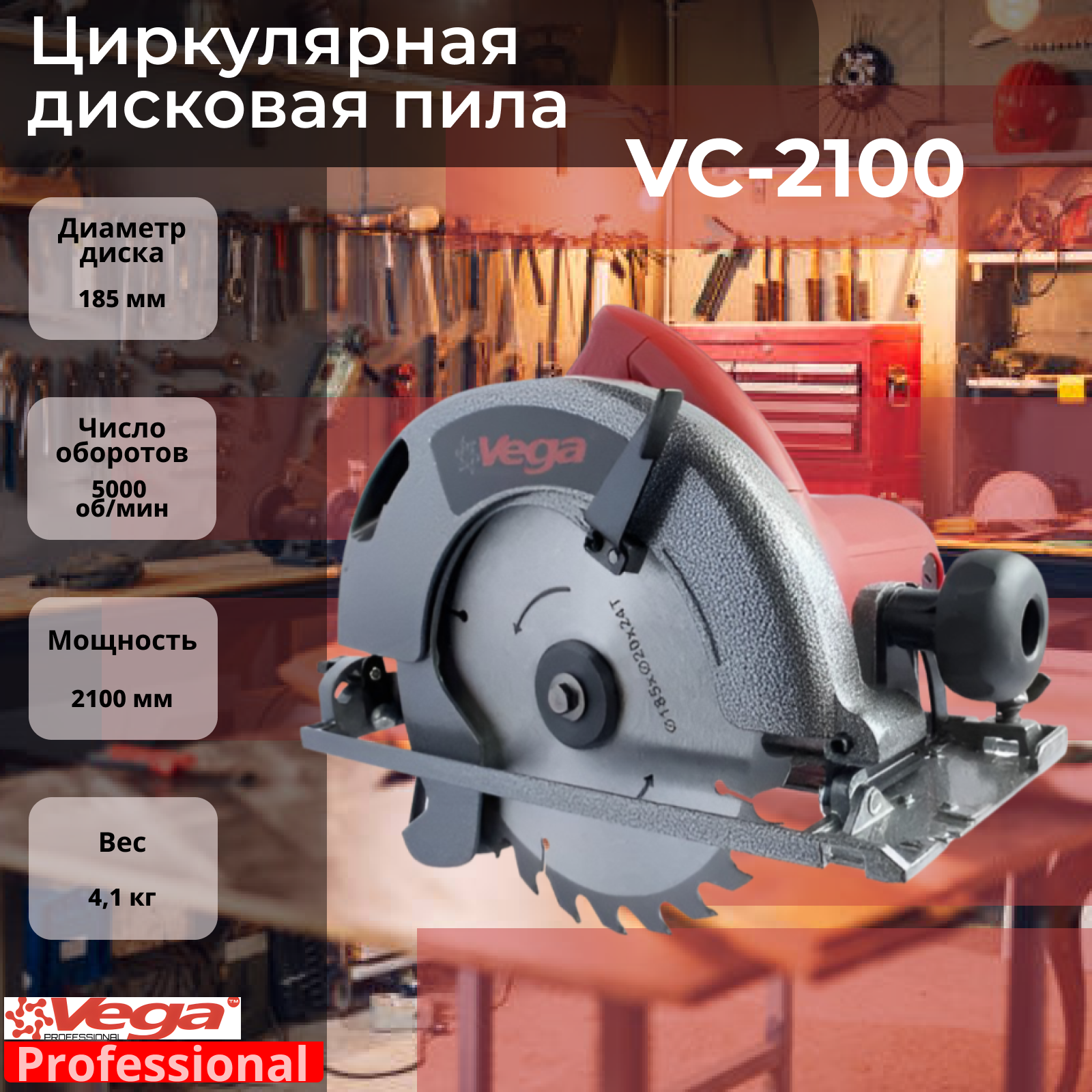 Циркулярная пила дисковая Vega Professional VC2100 диск 185мм, пропил 62мм, 5000об/мин, 2100Вт