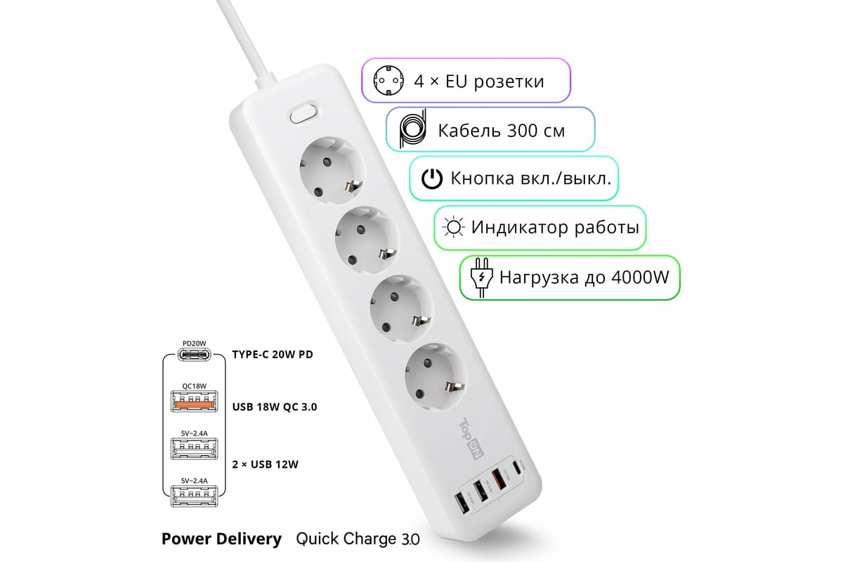 Купить Сетевой фильтр TopON TOP-PWS4 4 розетки, 3 USB, Type-C, PD 20W QC3.0, 4000W, 3м Белый