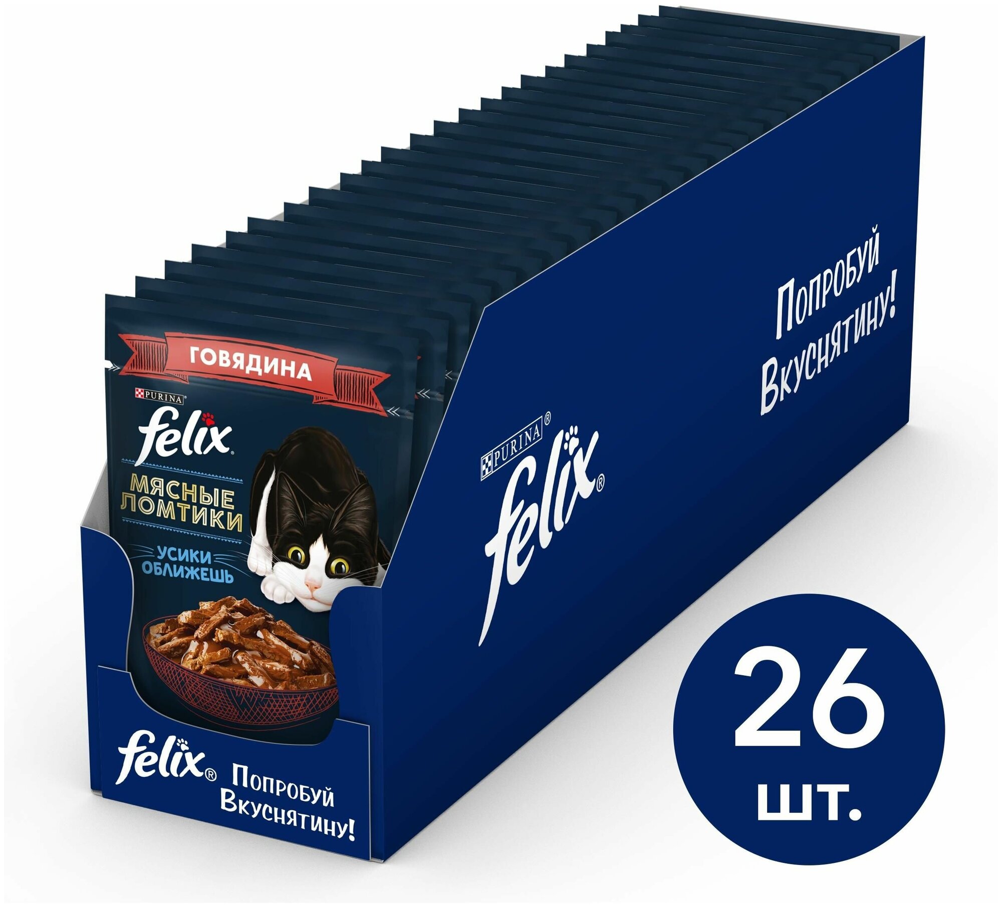 Влажный корм для кошек Felix Мясные ломтики Усики оближешь с говядиной 26 шт. х 75 г (кусочки в соусе)