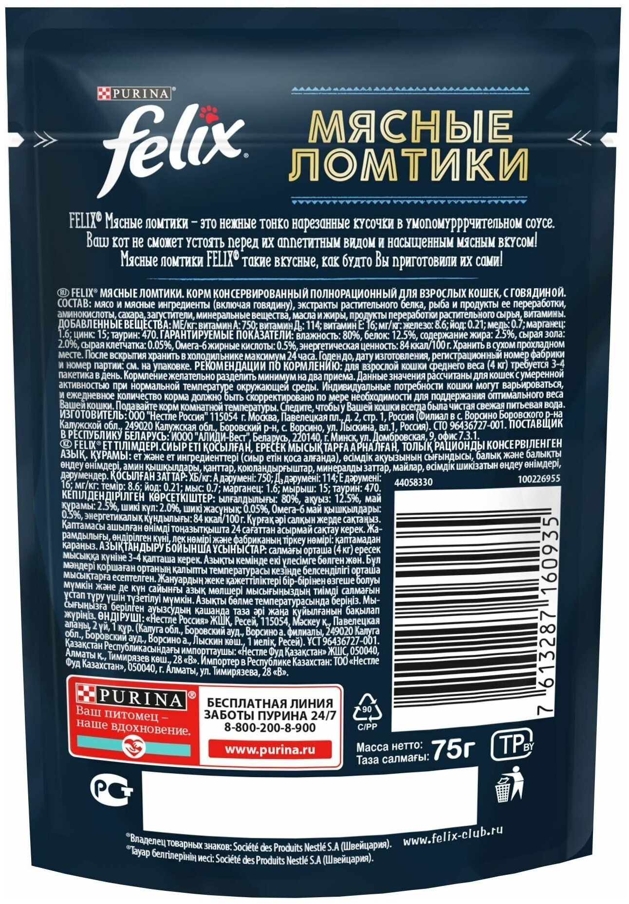Felix Мясные Ломтики влажный корм для взрослых кошек всех пород, говядина (26шт в уп) 75 гр