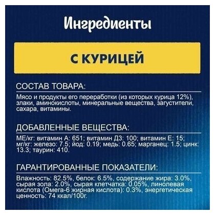 | Состав | мясо и продукты его переработки (из которых курица 12%), злаки, аминокислоты, минеральные вещества, загустители, сахара, витамины |